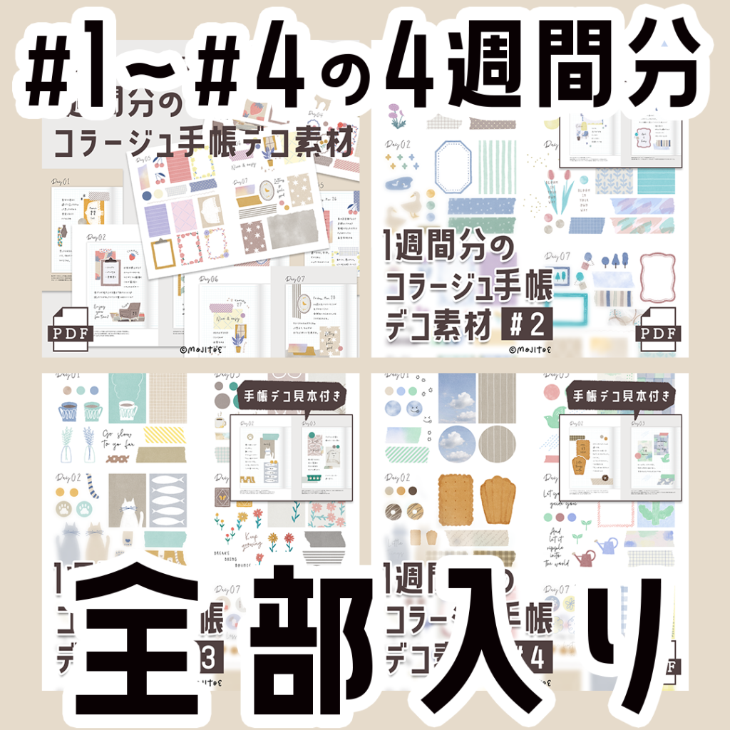 これまでに登場したコラージュ手帳デコ1週間分#1~#4を、4セットまとめた全部入りPDFをアップしました✨