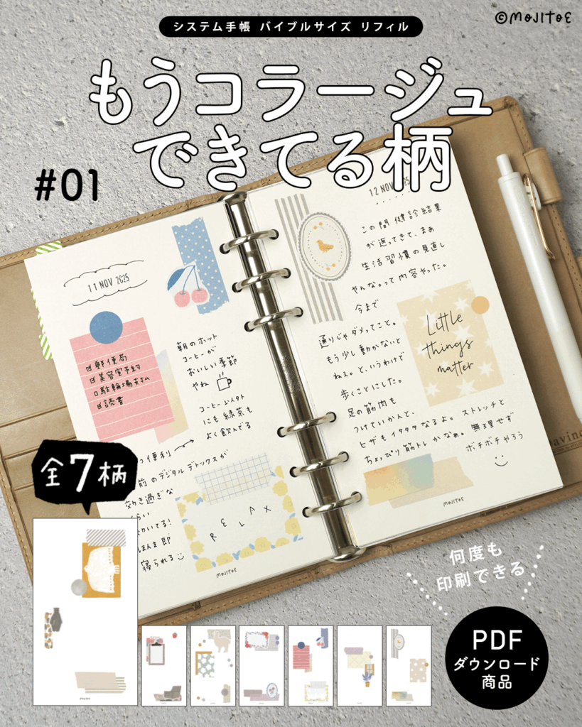 ※リフィルの正確なサイズで印刷することで、穴位置・余白がきれいに収まります。