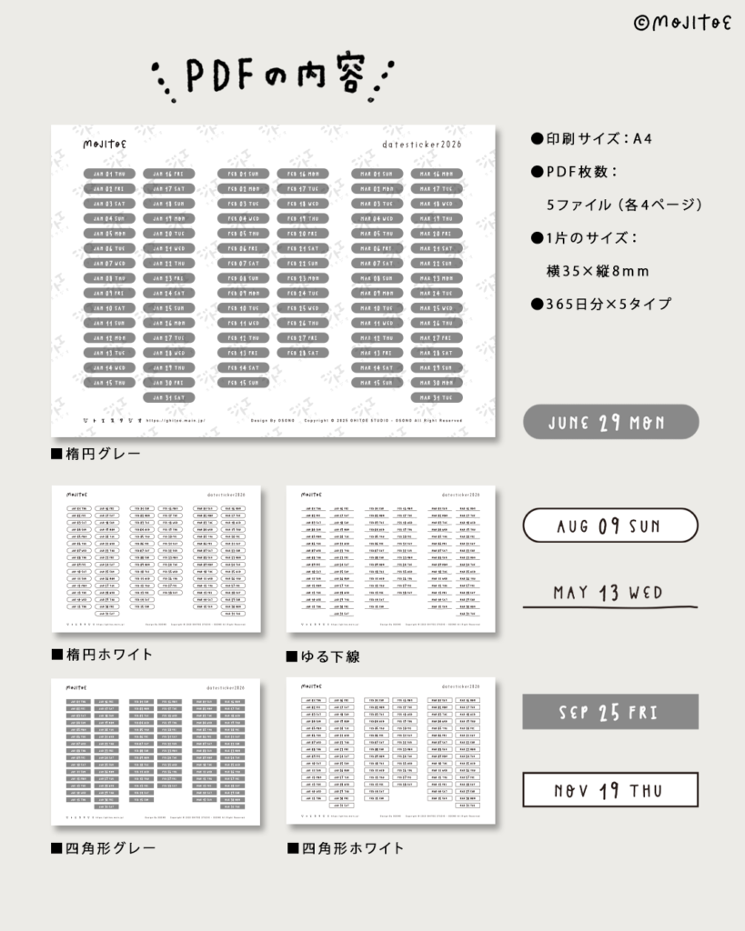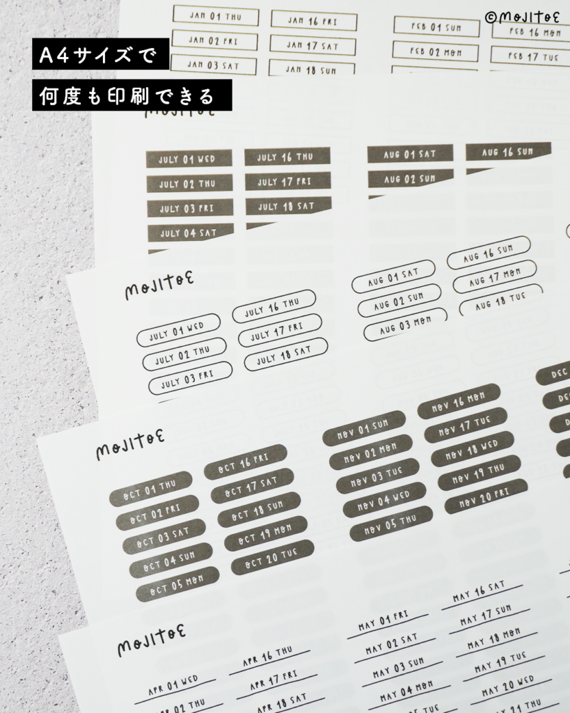 A4サイズで何度も印刷でき、たっぷり使える日付素材です。