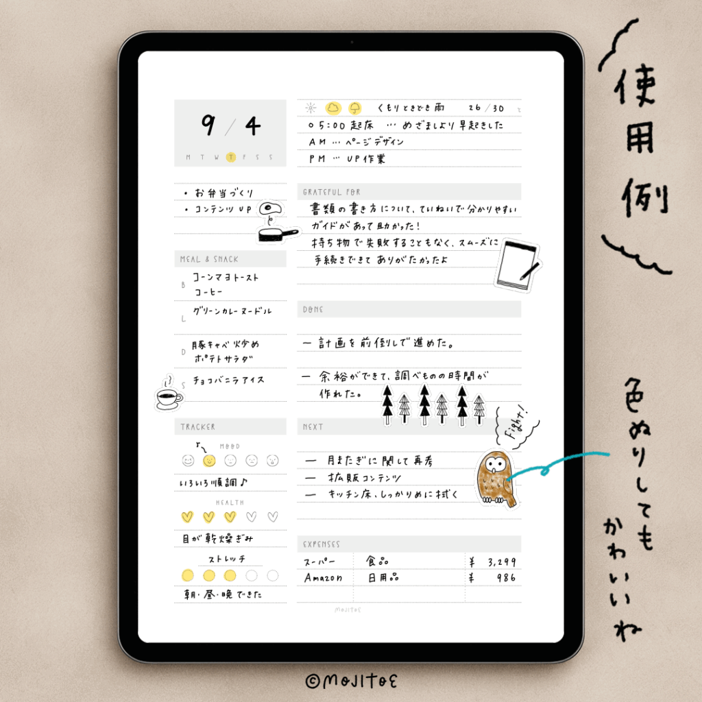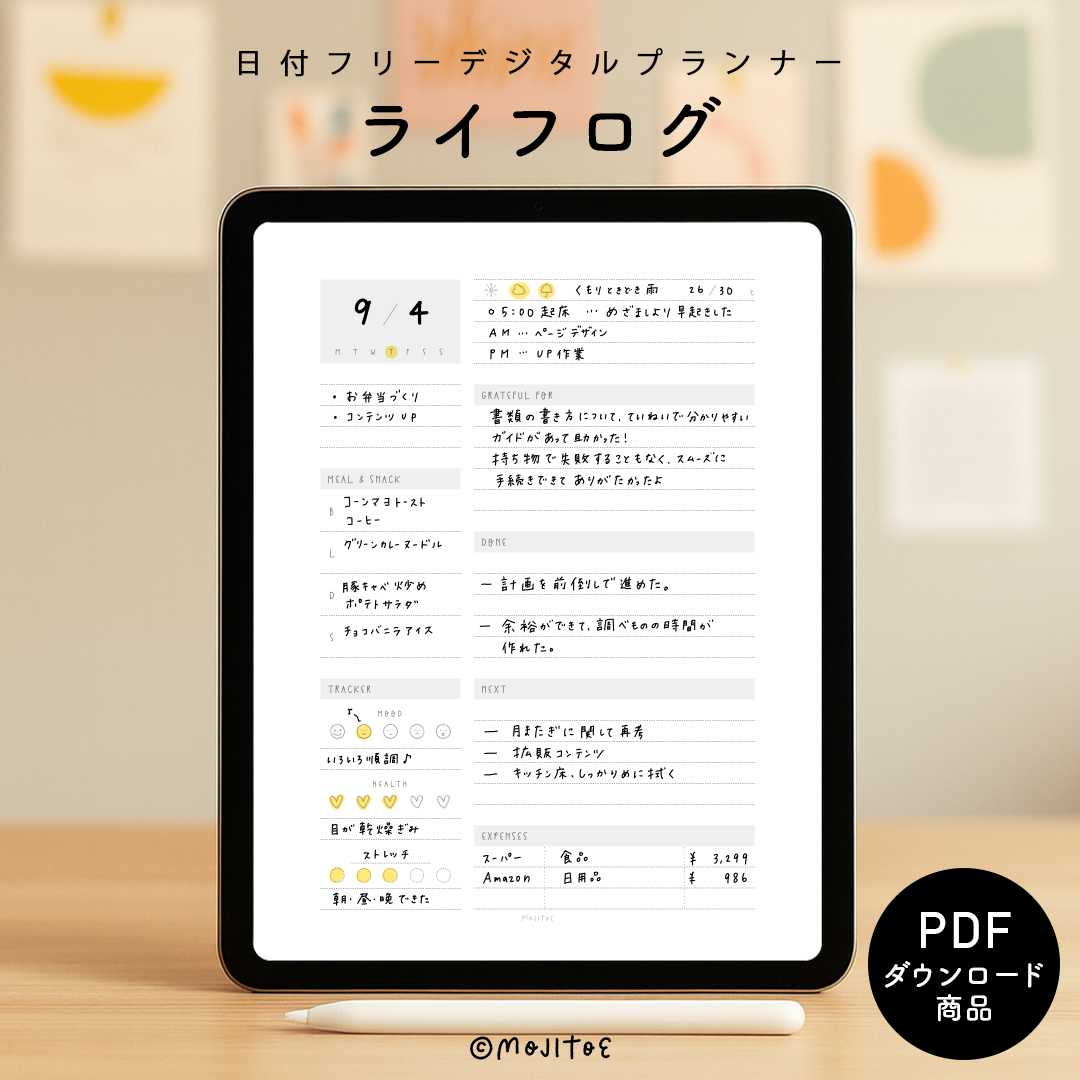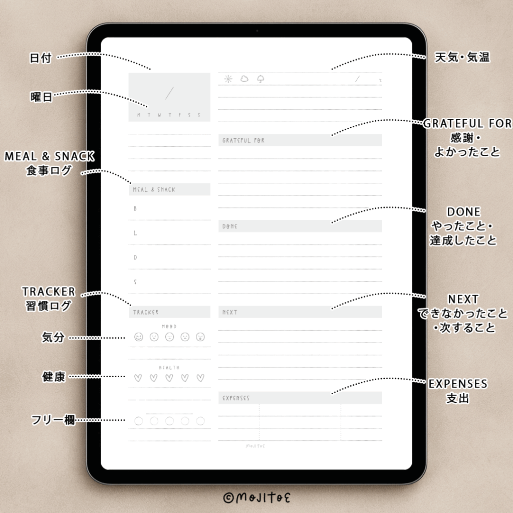 まずは、ジトエスタジオ初のデジタルプランナー。毎日をゆるっと楽しくログできる! 1日1ページ形式のデイリープランナーPDFです。 お使いのデジタルプランナーアプリにインポートして、すぐにお使いいただけます。