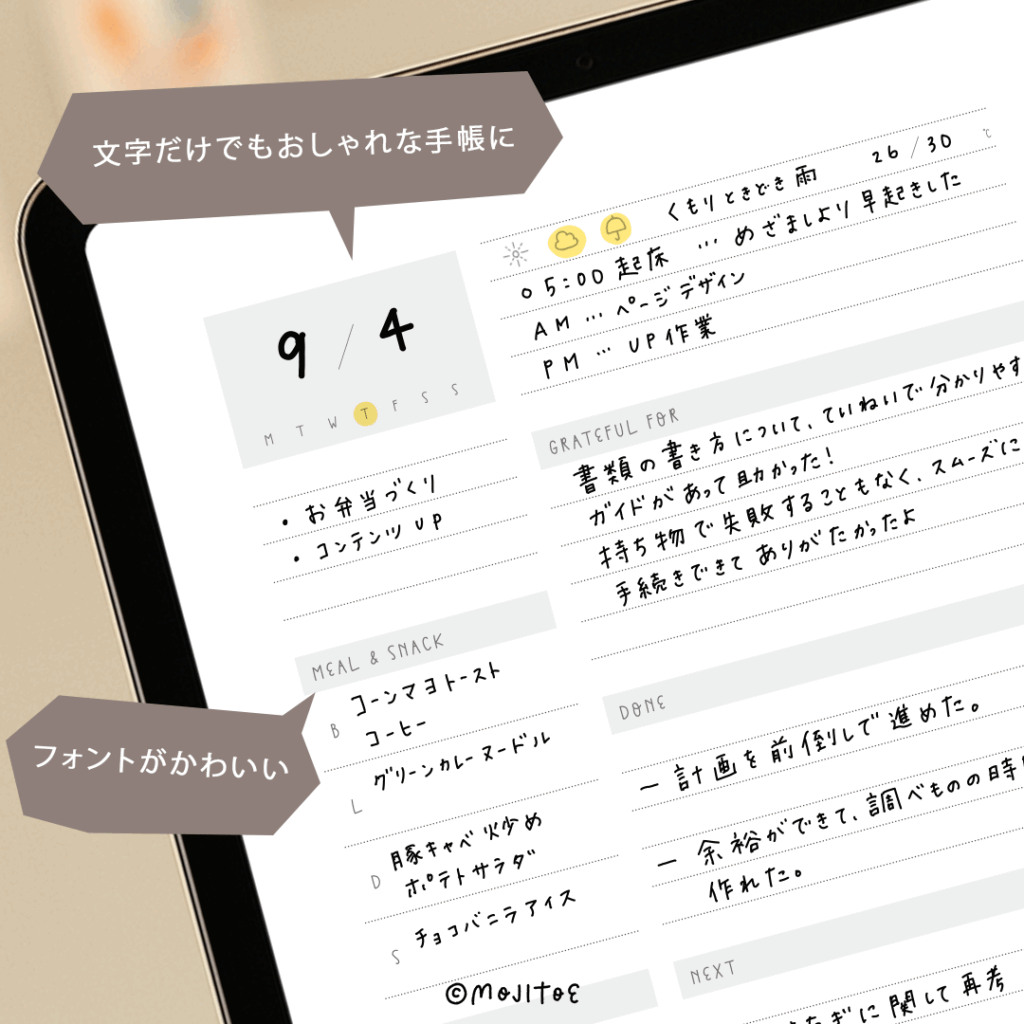 日々の小さな気づきや達成を「見える化」して、気持ちよく振り返りができます。 フォントはゆるっとかわいいオリジナル書体。文字を書き込むだけでおしゃれな雰囲気に仕上がります。