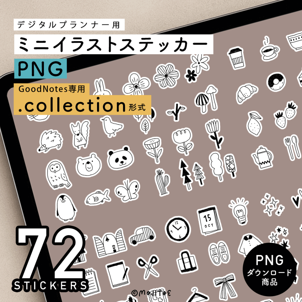 デジタルプランナーを楽しむためのミニイラスト72個セットです。 お使いのデジタルプランナーやノートアプリにインポートしてご利用いただける PNGステッカー です。