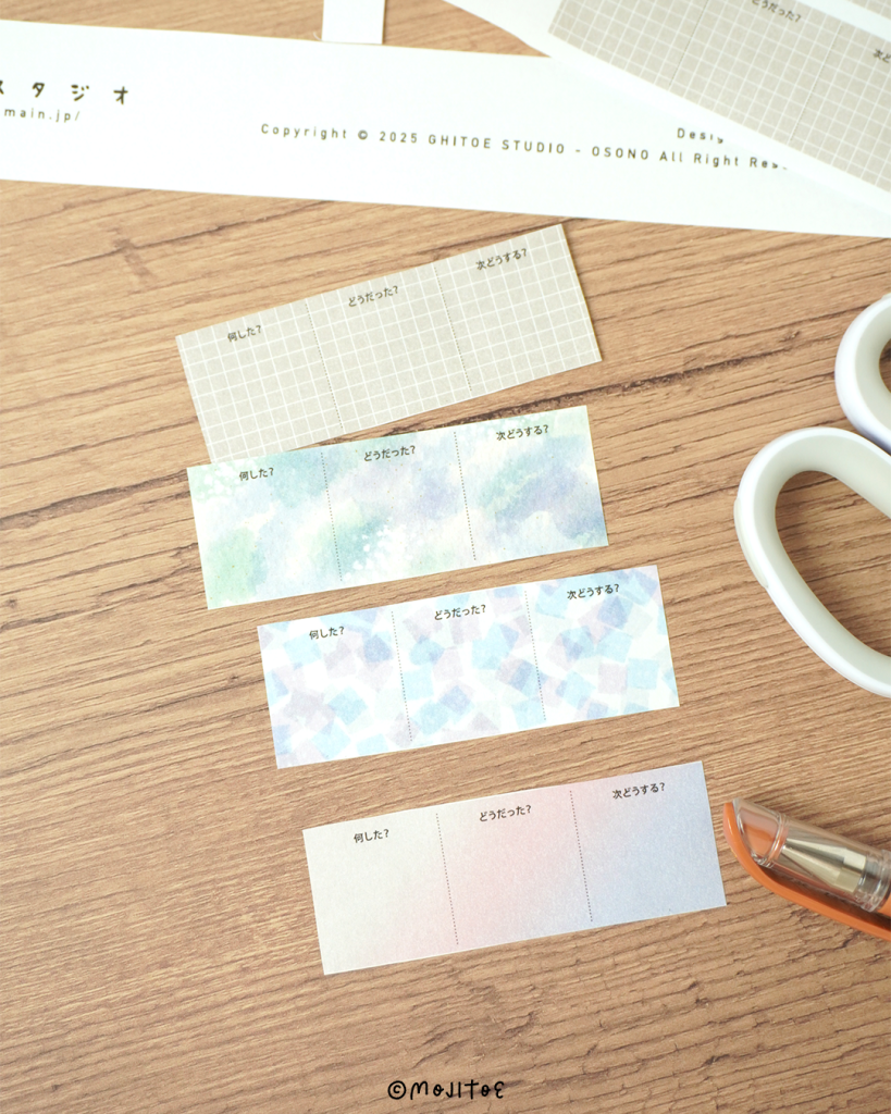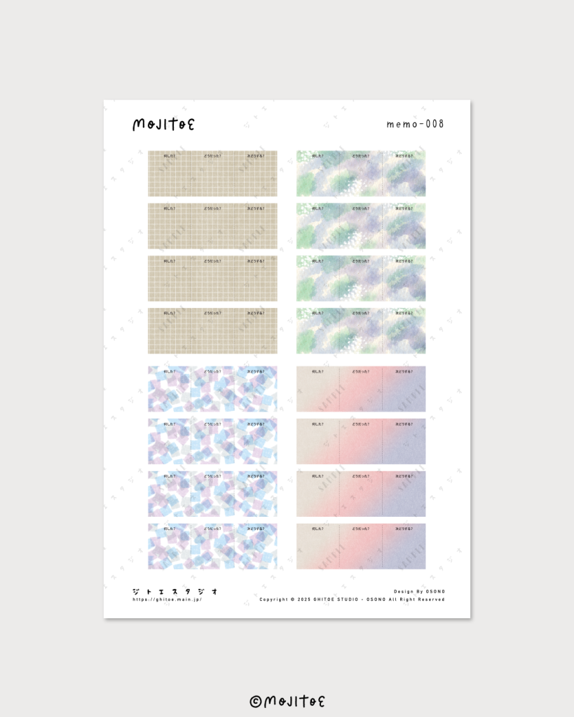 2025.04.22 お知らせ 手帳素材PDF「3つの質問ミニメモ 4柄入り」をアップしました osono 手帳デコなどに使えるデザインペーパーPDFです。A4サイズでプリントアウトし、カットしてご利用いただけます。※ダウンロード商品です BOOTHの販売ページへ【手帳素材PDF】3つの質問ミニメモ 4柄入り 気になった方はぜひBOOTHの販売ページをチェックしてみてくださいね♪ BOOTHの販売ページへ【手帳素材PDF】3つの質問ミニメモ 4柄入り #PDF#ミニメモ ABOUT ME OSONOコンテンツクリエイターXInstagramYouTubeContact京都在住のコンテンツクリエイター🎨 文字やイラストの描き方、手帳デコのアイデアなどを中心に 手帳やノートの使い方・書き方・楽しさを提案しています📖 『大好きなカラーペンでワクワク広がる!簡単デザイン文字』(翔泳社)『イメージとレイアウトで探しやすい 手描き文字&簡単イラスト アイデア帳』(KADOKAWA)ほか、以前の活動名「今田里美」名義での著書も多数✨