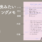 ミーティングの内容を書き留めるメモPDF。手帳に挟んで持ち歩きやすいA6サイズです。A4サイズでプリントアウトし、カットしてご利用いただけます。